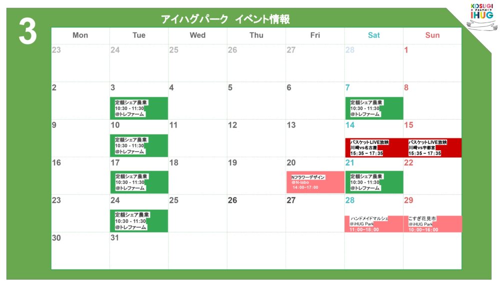 3月度のコスギアイハグでのイベントカレンダーになります。