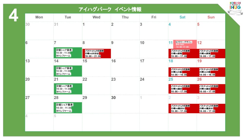 4月度のコスギアイハグでのイベントカレンダーになります。